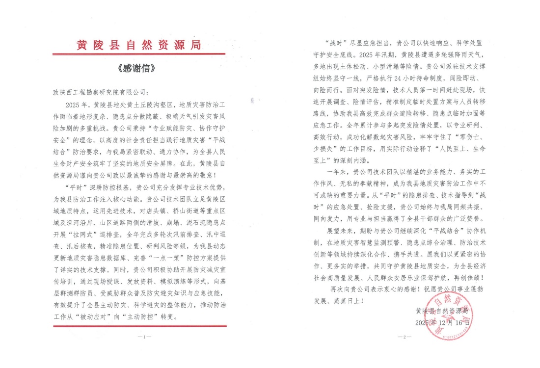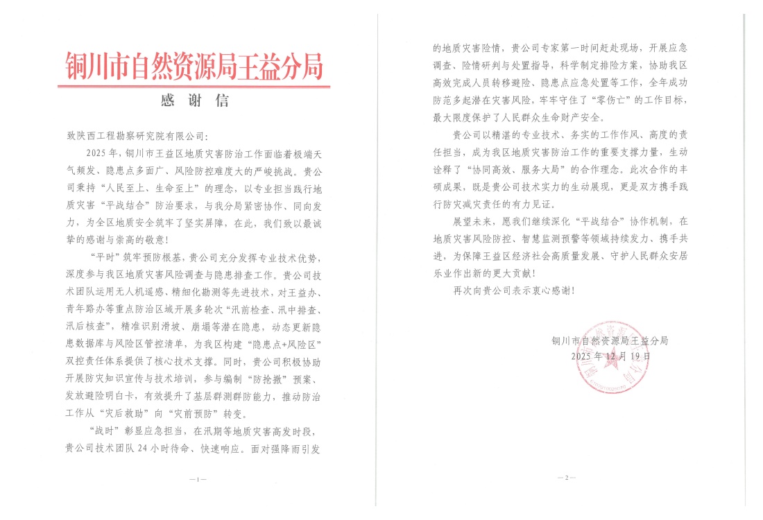 近日,公司接連收到黃陵縣、王益區(qū)、黃龍縣自然資源部門發(fā)來的感謝信,對公司在2025年度地質(zhì)災(zāi)害技術(shù)支撐工作中表現(xiàn)出的專業(yè)能力、高效響應(yīng)與奉獻精神給予高度評價和誠摯感謝。